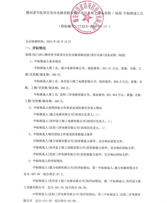 雅州壹號院項目室內(nèi)電梯采購安裝(項目名稱)設(shè)備采購/標(biāo)段中標(biāo)候選人公示