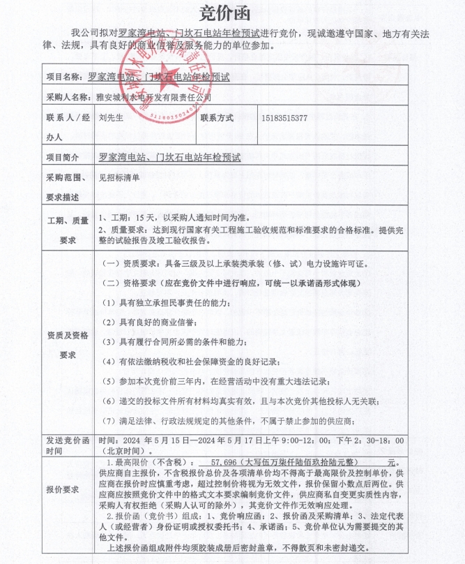 羅家灣電站、門坎石電站年檢預(yù)試競價(jià)公告