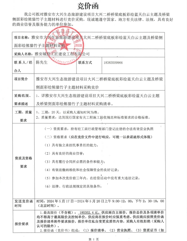 雅安市大興生態(tài)旅游建設(shè)項(xiàng)目大興二橋橋梁底板彩繪藍(lán)天白云主題及橋梁側(cè)面彩繪熊貓竹子主題材料采購競價(jià)公告