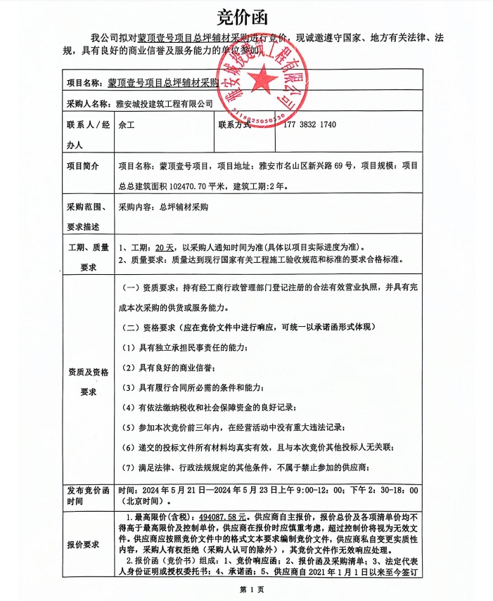 蒙頂壹號(hào)項(xiàng)目總坪輔材采購(gòu)競(jìng)價(jià)公告