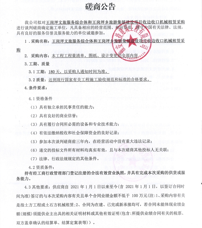 王崗坪文旅服務(wù)綜合體和王崗坪鄉(xiāng)旅游集鎮(zhèn)建設(shè)項(xiàng)目收邊收口機(jī)械租賃采購談判磋商公告