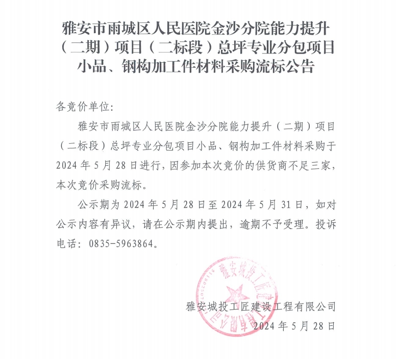 雅安市雨城區(qū)人民醫(yī)院金沙分院能力提升(二期)項(xiàng)目(二標(biāo)段)總坪專業(yè)分包項(xiàng)目小品、鋼構(gòu)加工件材料采購(gòu)流標(biāo)公告