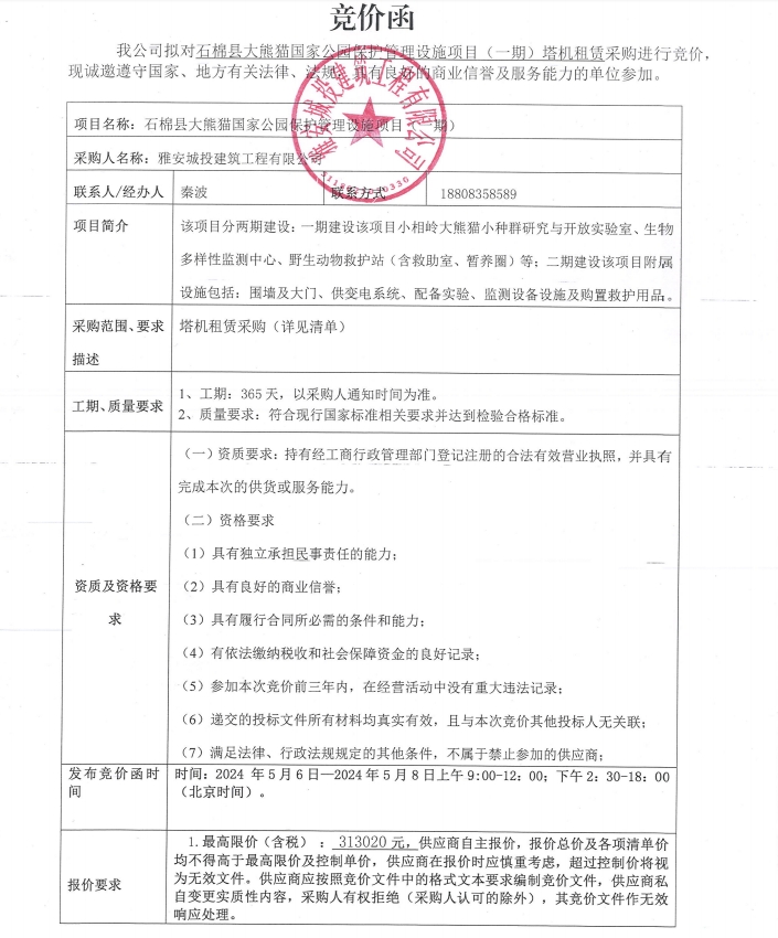 石棉縣大熊貓國家公園保護管理設施項目(一期)塔機租賃采購競價公告