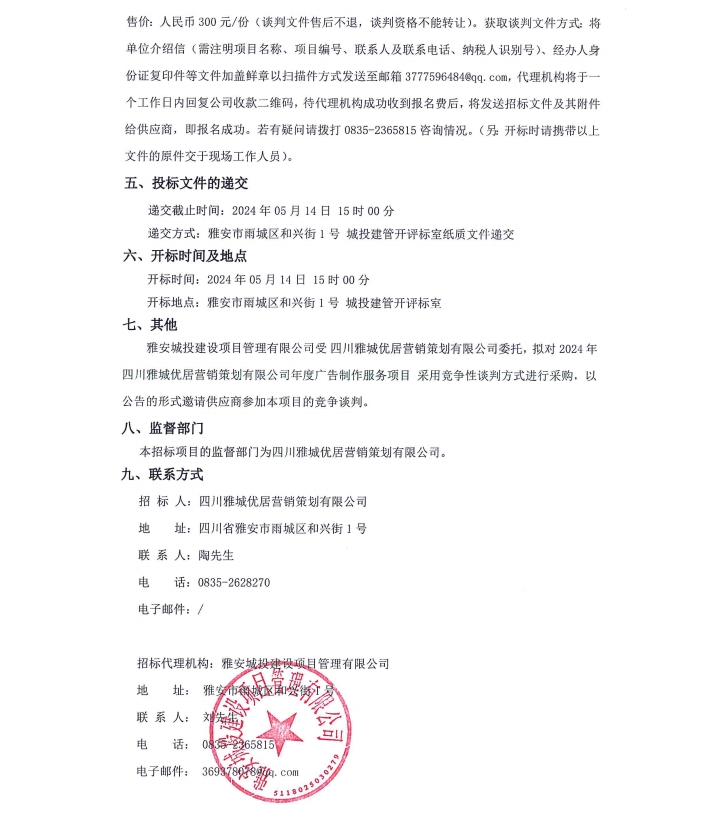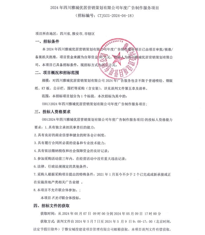 2024年四川雅城優(yōu)居營(yíng)銷(xiāo)策劃有限公司年度廣告制作服務(wù)項(xiàng)目公告