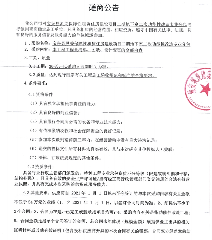 寶興縣靈關(guān)保障性租賃住房建設(shè)項目二期地下室二次功能性改造專業(yè)分包談判磋商公告