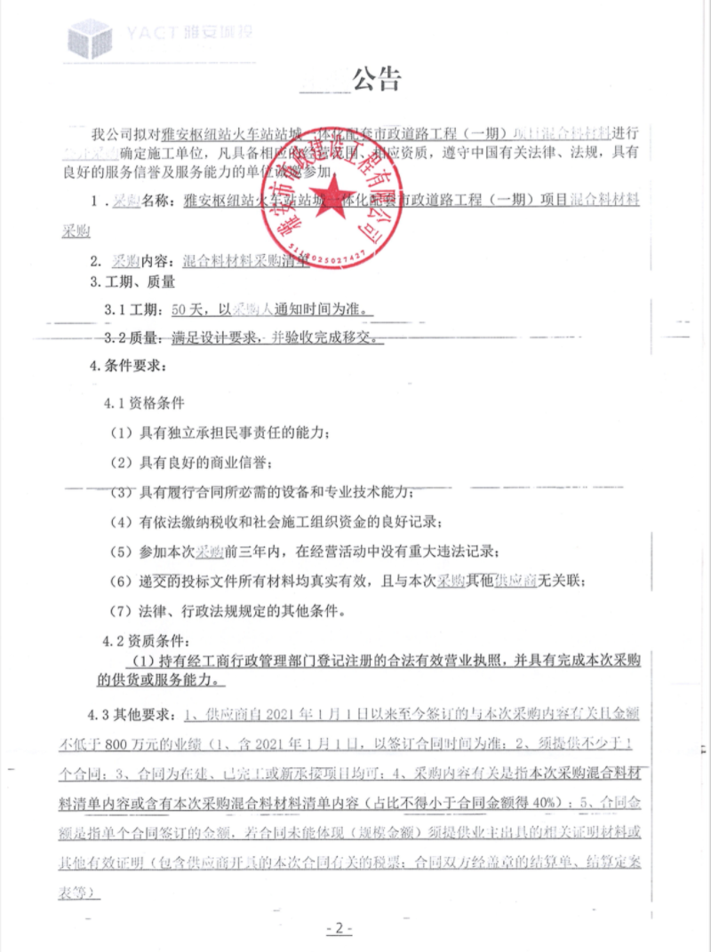 雅安樞紐站火車站站城一體化配套市政道路工程(一期)項(xiàng)目混合材料采購公告