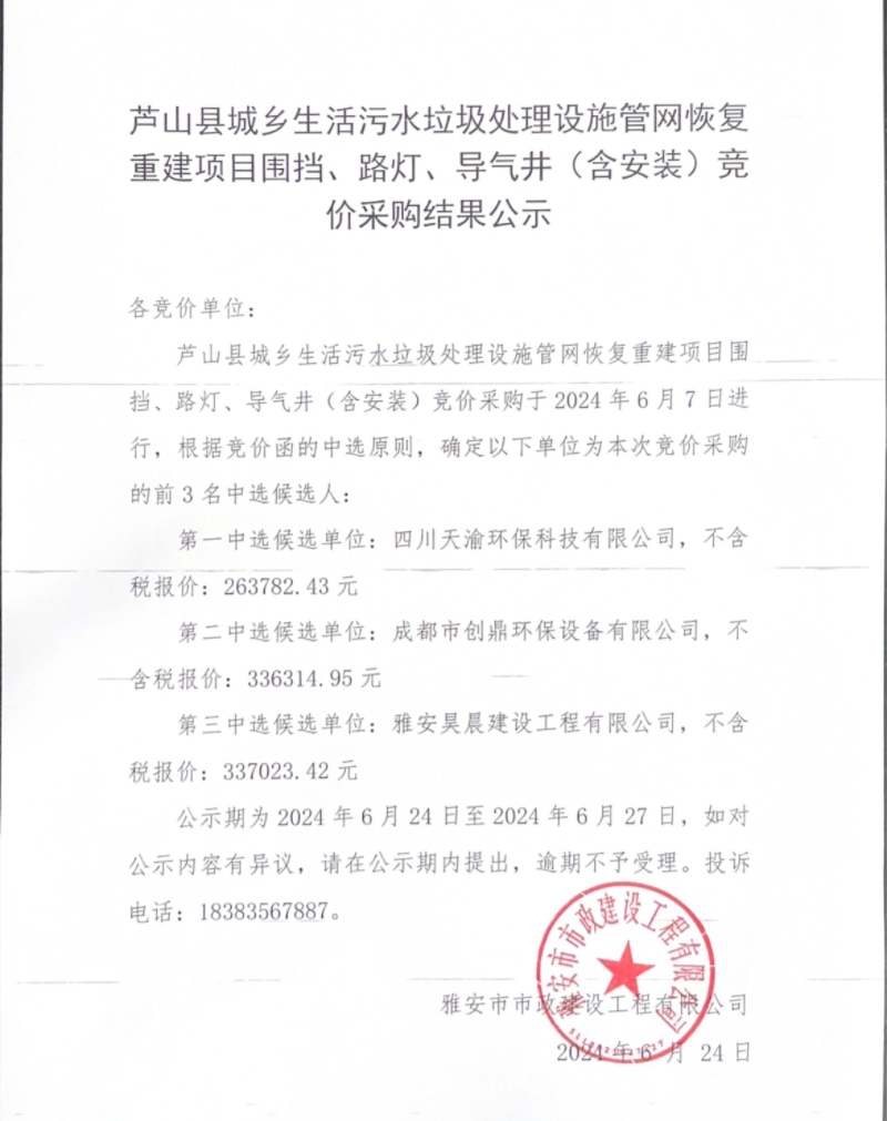 蘆山縣城鄉(xiāng)生活污水垃圾處理設(shè)施管網(wǎng)恢復(fù)重建項(xiàng)目圍擋、路燈、導(dǎo)氣井(含安裝)競價(jià)采購結(jié)果公示