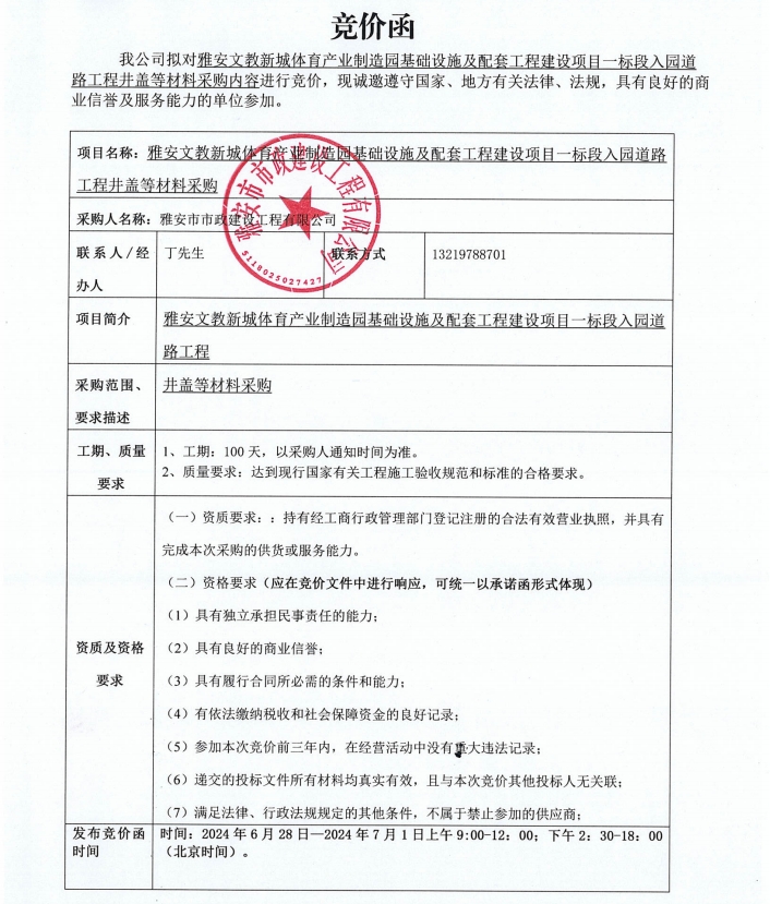 雅安文教新城體育產(chǎn)業(yè)制造園基礎(chǔ)設(shè)施及配套工程建設(shè)項目一標段入園道路工程項目井蓋等材料采購競價公告