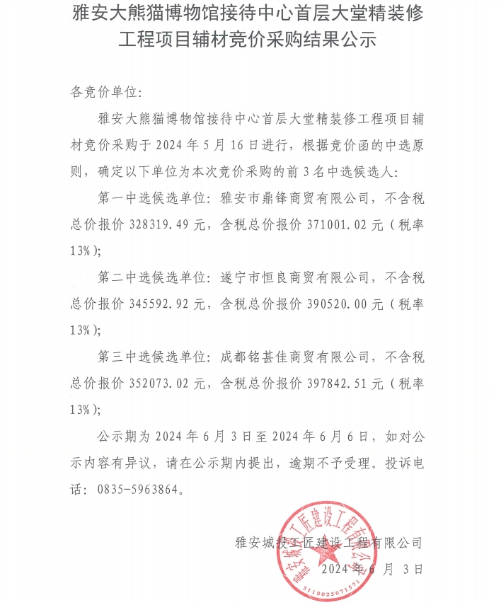 雅安大熊貓博物館接待中心首層大堂精裝修工程項目輔材競價采購結(jié)果公示