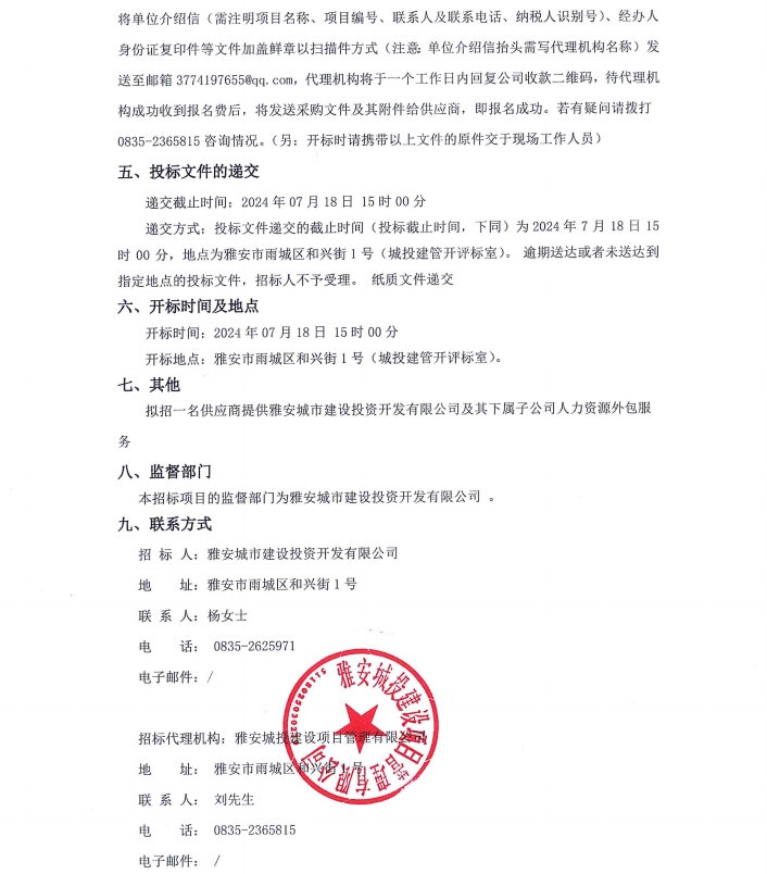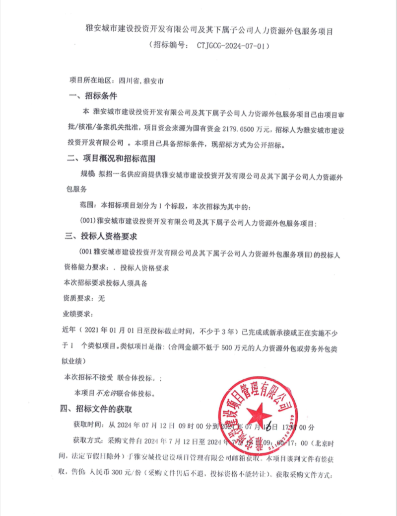 雅安城市建設(shè)投資開發(fā)有限公司及其下屬子公司人力資源外包服務(wù)項(xiàng)目公告