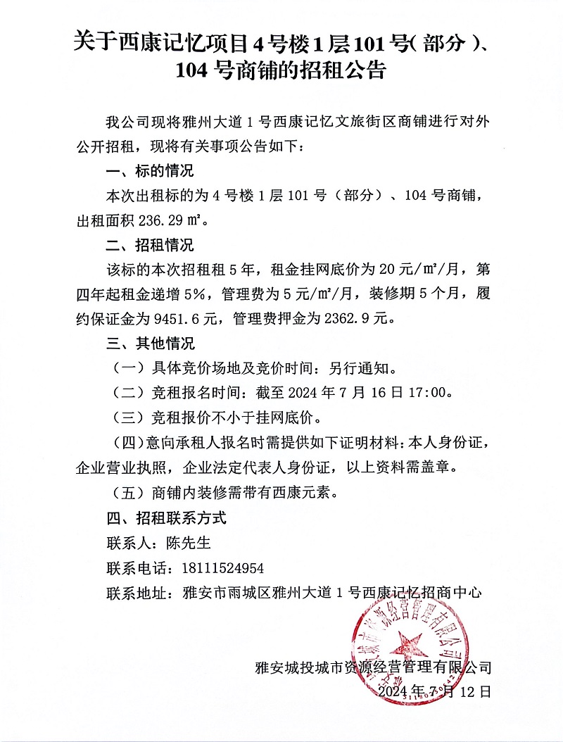 關(guān)于西康記憶項(xiàng)目4號樓1層101號(部分)、104號商鋪的招租公告