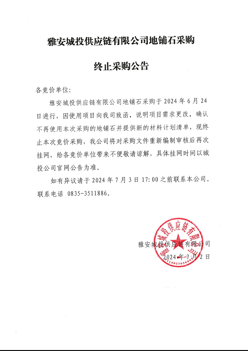 雅安城投供應(yīng)鏈有限公司地鋪石采購終止采購公告
