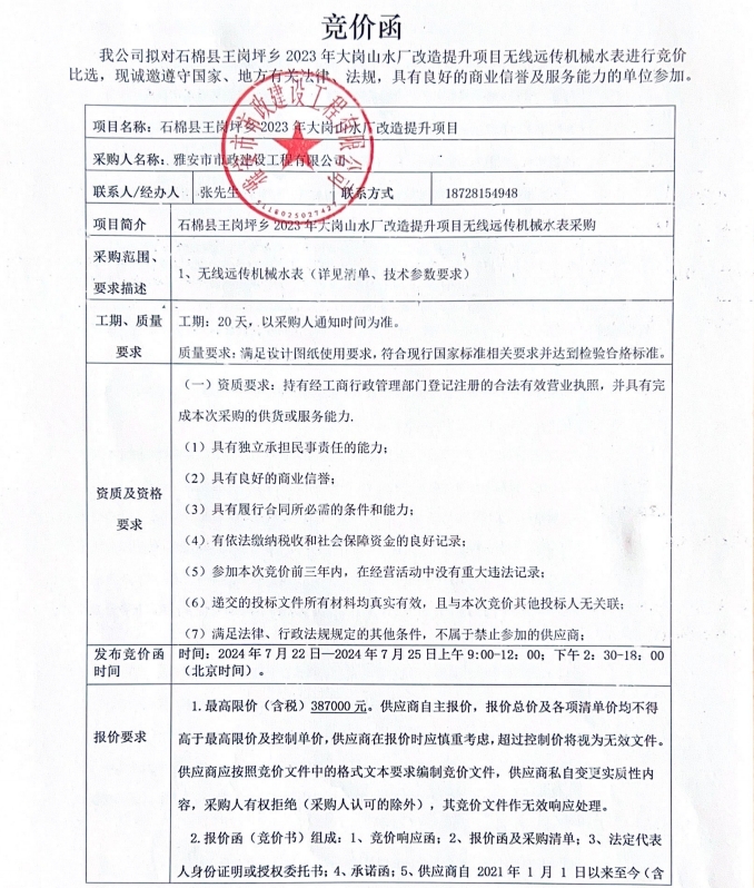 附件1:2023年大崗山水廠改造提升項(xiàng)目無(wú)線遠(yuǎn)傳機(jī)械水表競(jìng)價(jià)函