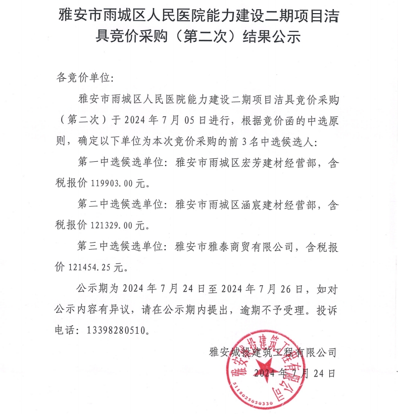 雅安市雨城區(qū)人民醫(yī)院能力建設二期項目潔具競價采購(第二次)結果公示