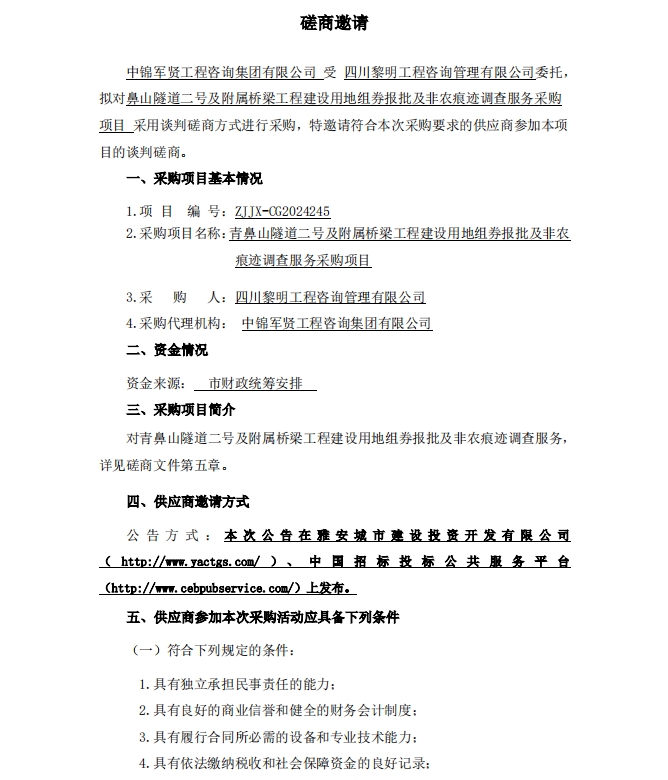 青鼻山隧道二號及附屬橋梁工程項目用地組劵報批及非農(nóng)痕跡調(diào)查服務采購項目磋商邀請公告