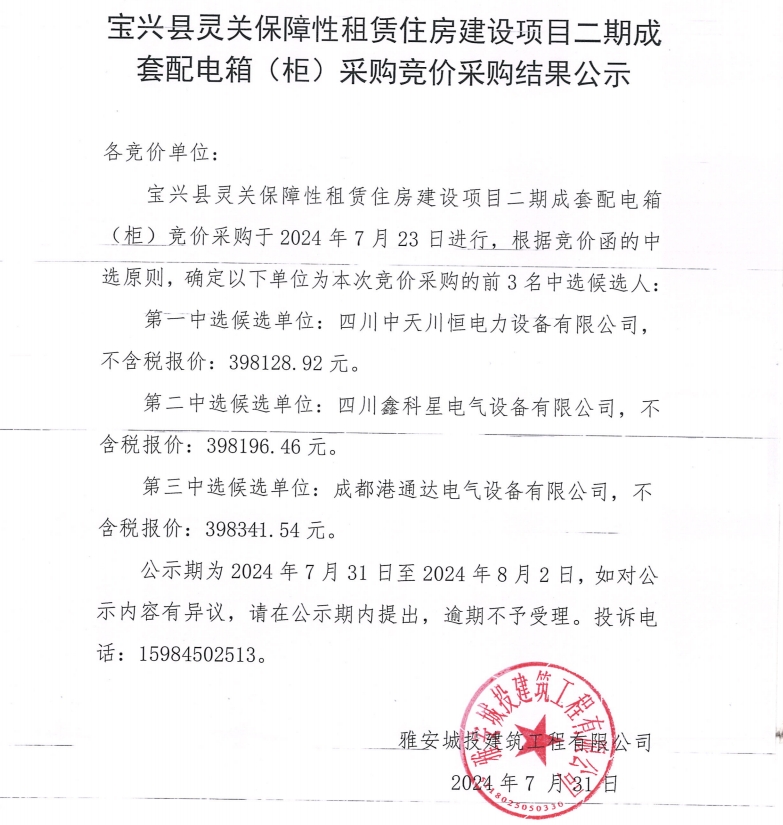 寶興縣靈關(guān)保障性租賃住房建設(shè)項目二期成套配電箱(柜)采購競價采購結(jié)果過公示