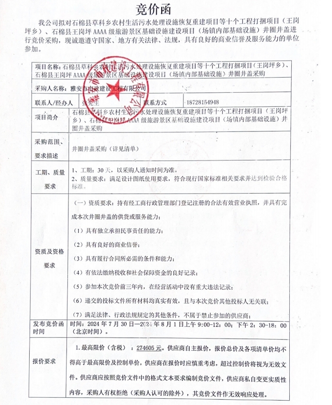 石棉縣草科鄉(xiāng)農(nóng)村生活污水處理設施恢復重建項目等十個工程打捆項目(王崗坪鄉(xiāng))、石棉縣王崗坪AAAA級旅游景區(qū)基礎設施建設項目(場鎮(zhèn)內(nèi)部基礎設施)井圈井蓋采購競價公告