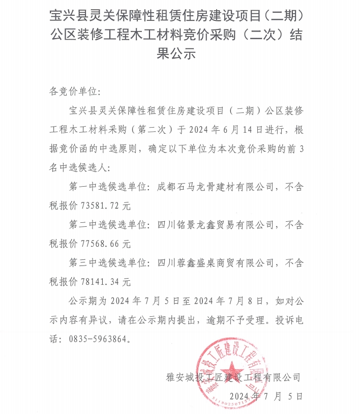 寶興縣靈關(guān)保障性租賃住房建設(shè)項(xiàng)目(二期)公區(qū)裝修工程木工材料競(jìng)價(jià)采購(gòu)(二次)結(jié)果公示