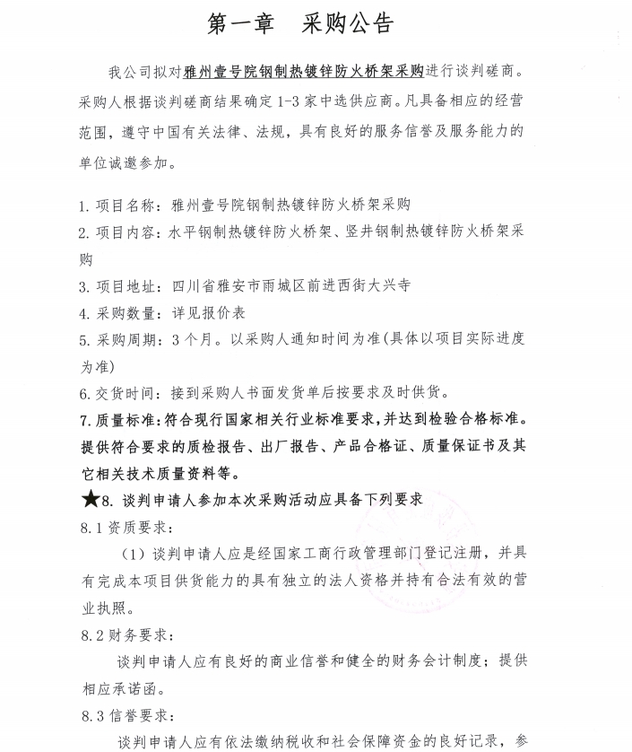 雅州壹號院鋼制熱鍍鋅防火橋架采購公告