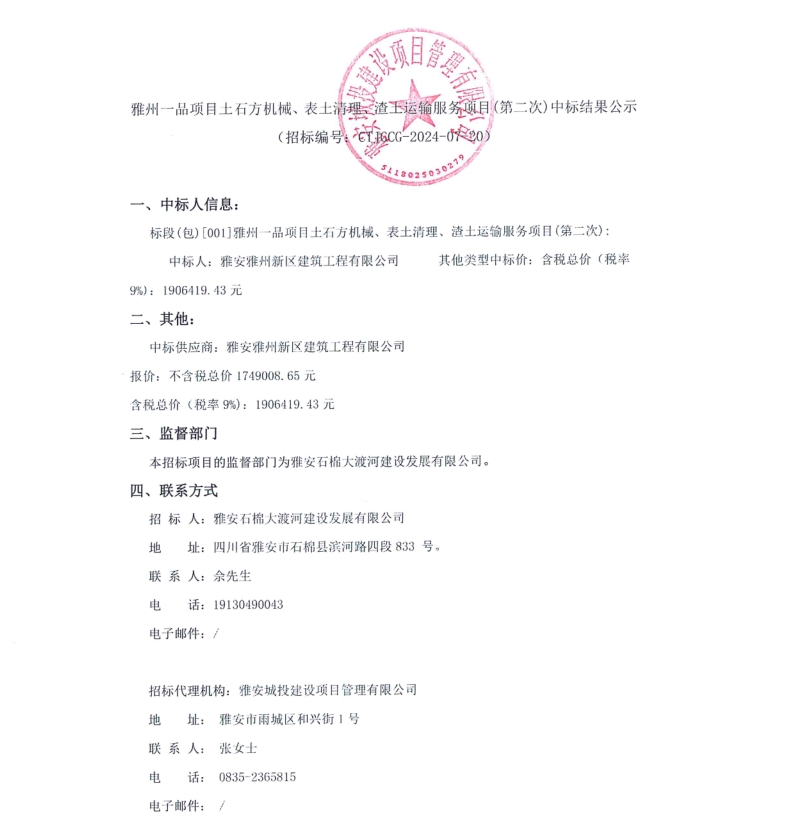 雅州一品項目土石方機械、表土清理、渣土運輸服務(wù)項目(第二次)中標(biāo)結(jié)果公示