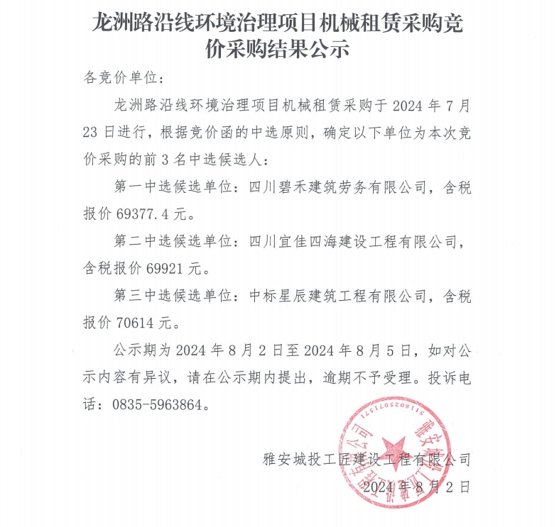 龍洲路沿線環(huán)境治理項(xiàng)目機(jī)械租賃采購競(jìng)價(jià)采購結(jié)果公示