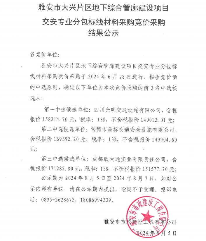 雅安市大興片區(qū)地下綜合管廊建設(shè)項(xiàng)目道路專業(yè)分包標(biāo)線材料采購(gòu)競(jìng)價(jià)采購(gòu)結(jié)果公示