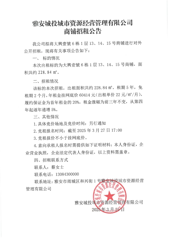 雅安城投城市資源經(jīng)營(yíng)管理有限公司商鋪招租公告