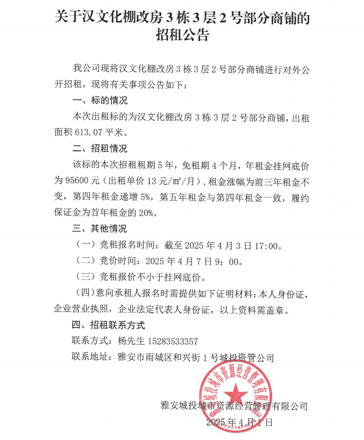 關(guān)于漢文化棚改房3棟3層2部分號商鋪的招租公告