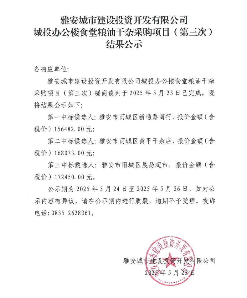 雅安城市建設(shè)投資開發(fā)有限公司城投辦公樓食堂糧油干雜采購項目(第三次)結(jié)果公示