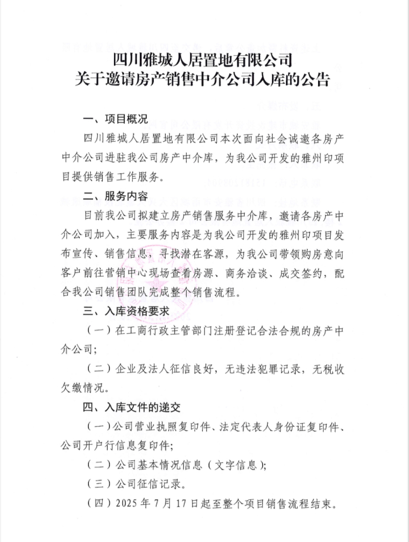 四川雅城人居置地有限公司關(guān)于邀請(qǐng)房產(chǎn)銷(xiāo)售中介公司入庫(kù)的公告