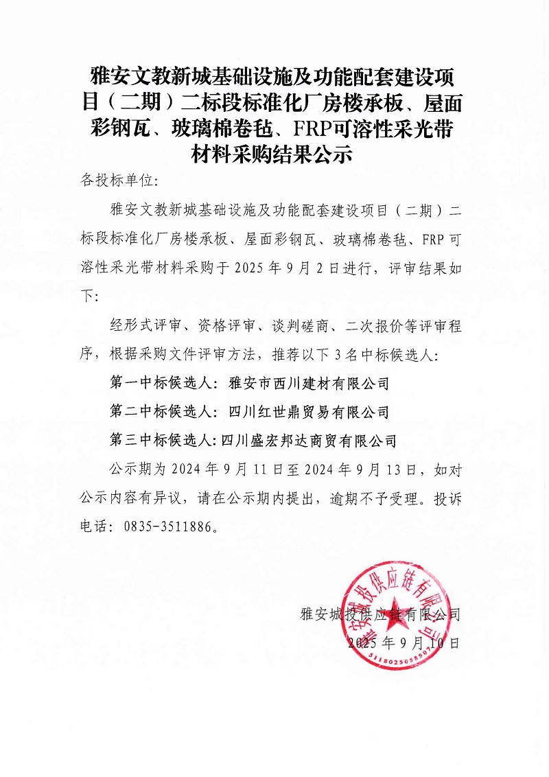 雅安文教新城基礎(chǔ)設(shè)施及功能配套建設(shè)項(xiàng)目(二期)二標(biāo)段標(biāo)準(zhǔn)化廠(chǎng)房樓承板、屋面彩鋼瓦、玻璃棉卷氈、FRP可溶性采光帶材料采購(gòu)結(jié)果公示