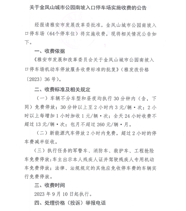 關于金鳳山城市公園南坡入口停車場實施收費的公告
